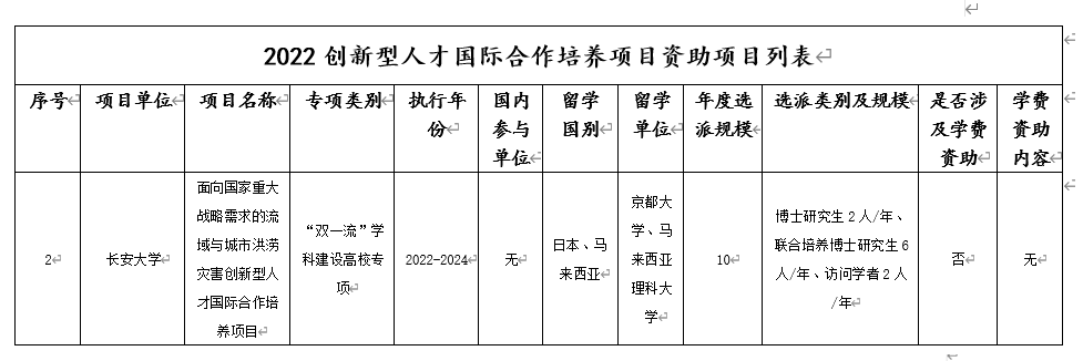 项目每年可资助10人赴日本京都大学及马来西亚理科大学开展学生联合培养与科研合作。其中每年可资助博士研究生2人、联合培养博士研究生6人、访问学者2人,项目获批资助期限为三年,三年可滚动资助30人,滚动资助经费累计达900余万元。
