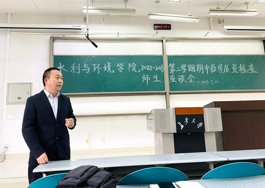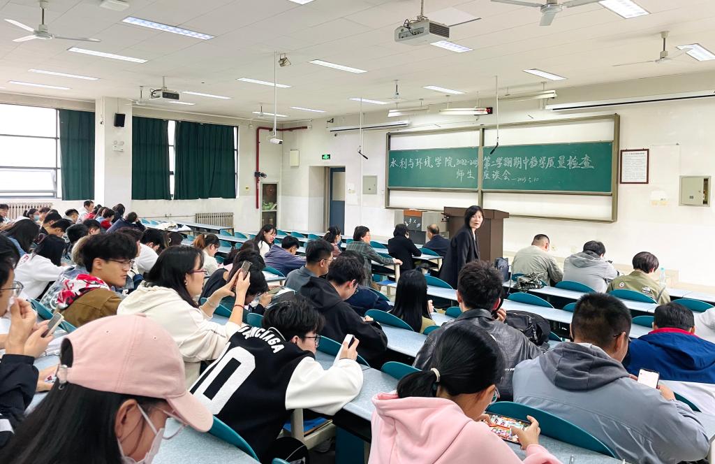 20235月1012:40学院本科期中教学质量检查师生座谈会在渭水校区WM1201教室举行。学院领导、本科教学督导各系主任、实验中心主任、教师代表、辅导员、学院教务人员、各班级学生代表参加座谈会。