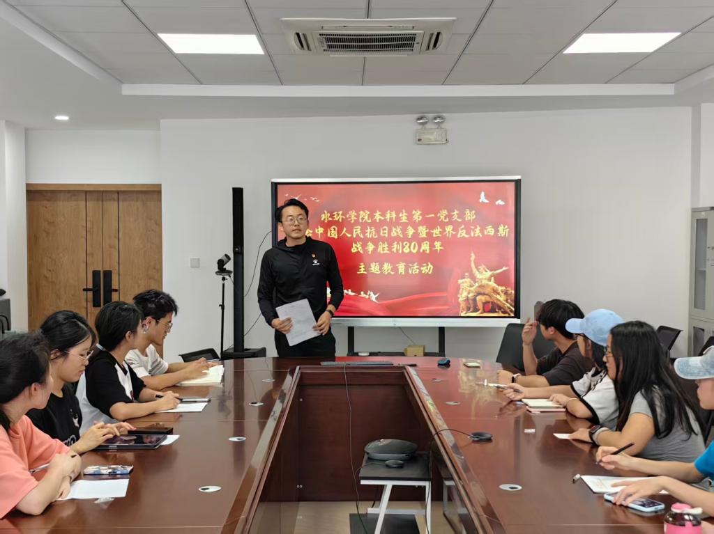 本科生第一党支部于朝晖园一站式社区研讨室组织开展了纪念中国人民抗日战争暨世界反法西斯战争胜利主题教育活动。本次会议由本科生第一党支部书记李金洋同志主持,支部全体党员参会。